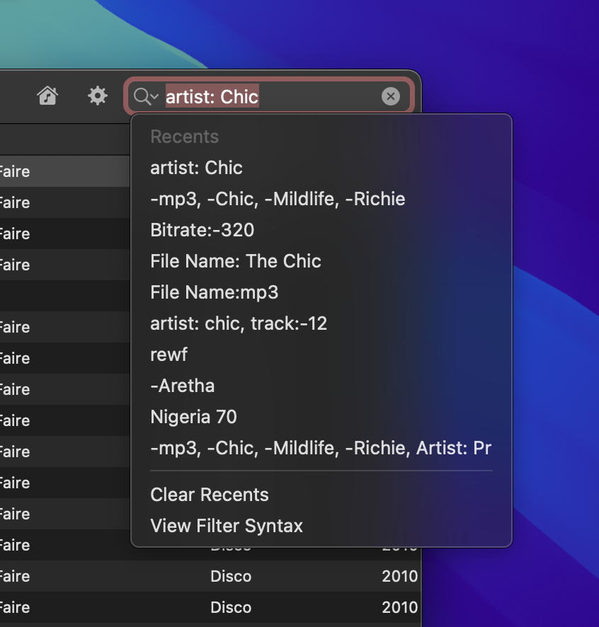 artist: Chic, album: Savoir Faire, File Name: mp3Separate each filter component with a comma