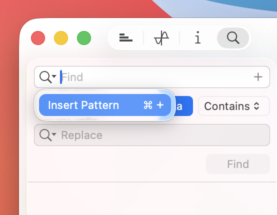 To add capture groups click the plus icon right to the Find field, or click the magnifying-glass icon and choose Insert Pattern from the menu.